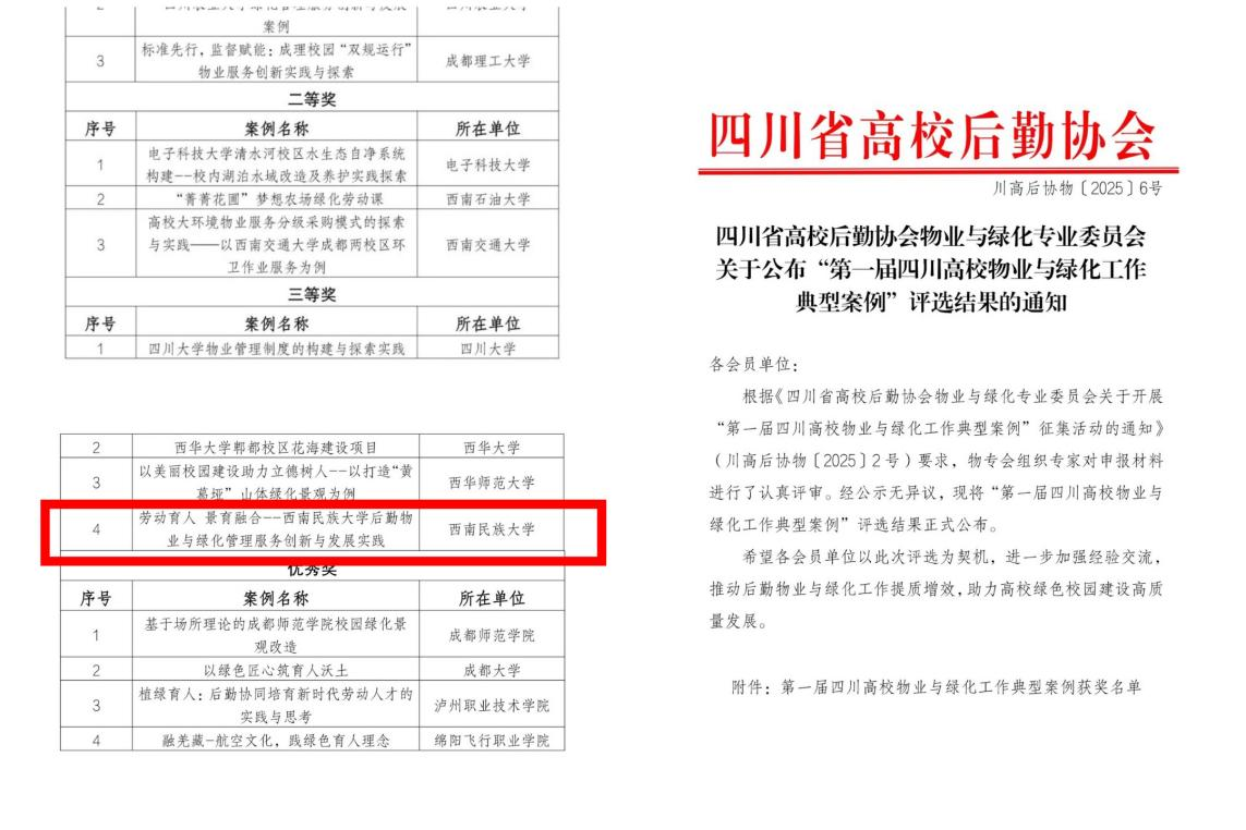 近日,中国教育后勤协会正式公示2025年度“高校后勤劳动育人实践基地”入围名单,西南民族大学凭借在劳动实践育人方面的系统化探索与扎实成效,经自主申报、地方推荐与专家评审等环节,最终成为全国民族高校中唯一入围单位,标志着学校在后勤育人领域的实践成果获得行业高度认可。